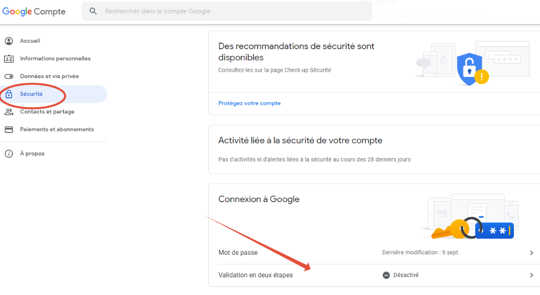 - Sous la rubrique Connexion à Google, sélectionnez Validation en deux étapes