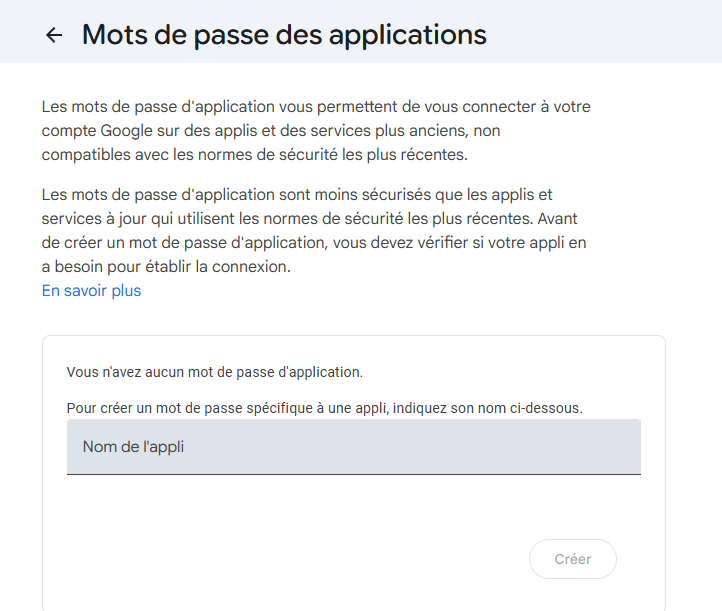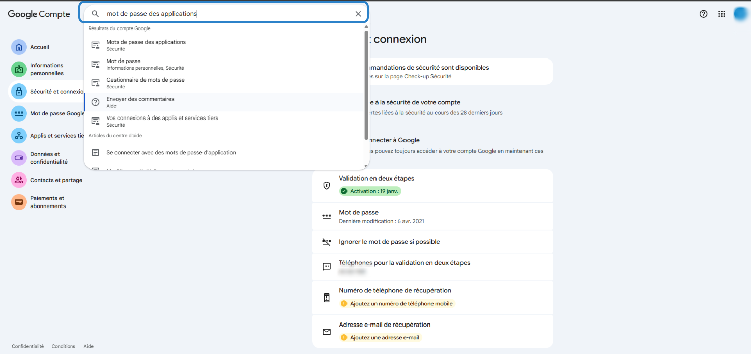 - Dans la barre de recherche de votre compte Google, saisissez “mot de passe d’application”.
