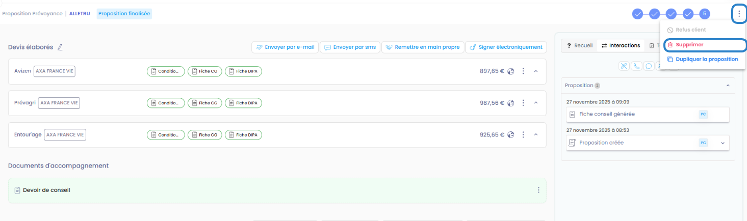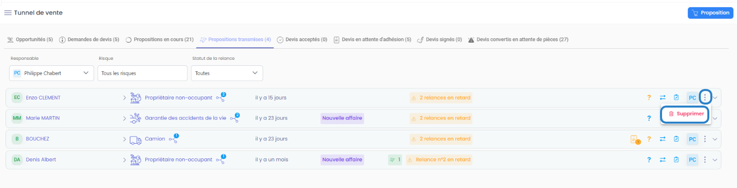 Vous avez besoin de retirer une proposition erronée, en doublon ou non pertinente ? La suppression d’une proposition permet de garder votre espace de travail clair et à jour et d'éviter toute confusion avec vos dossiers en cours