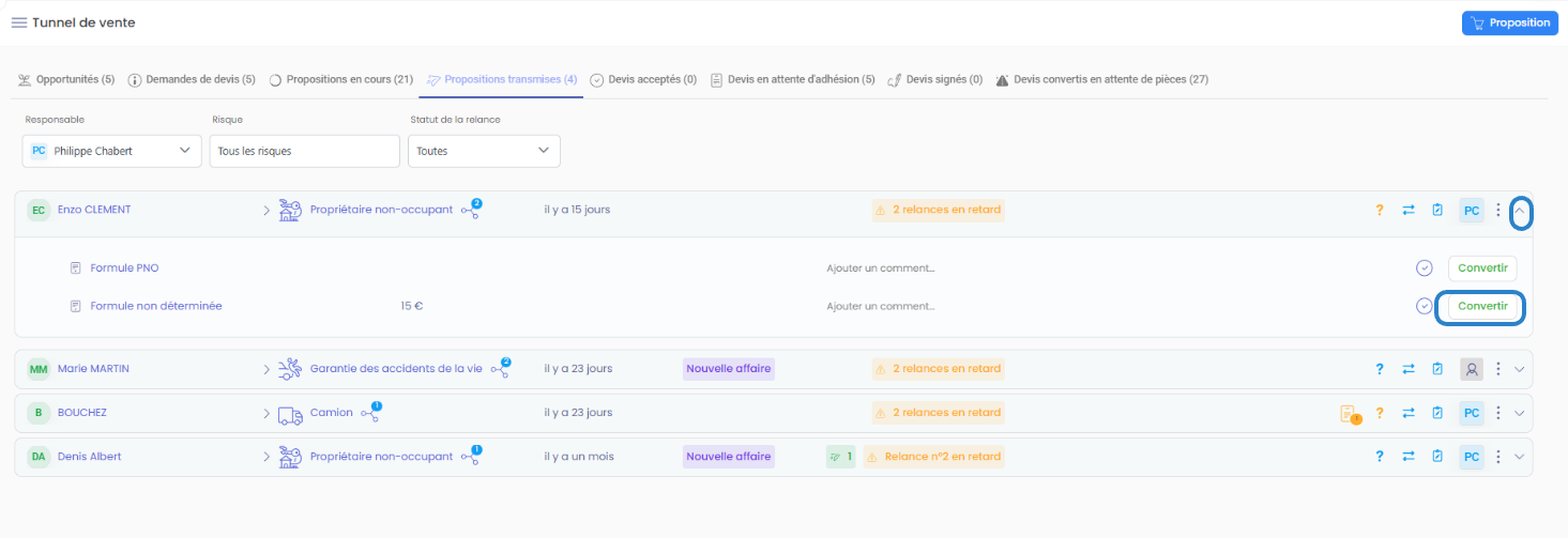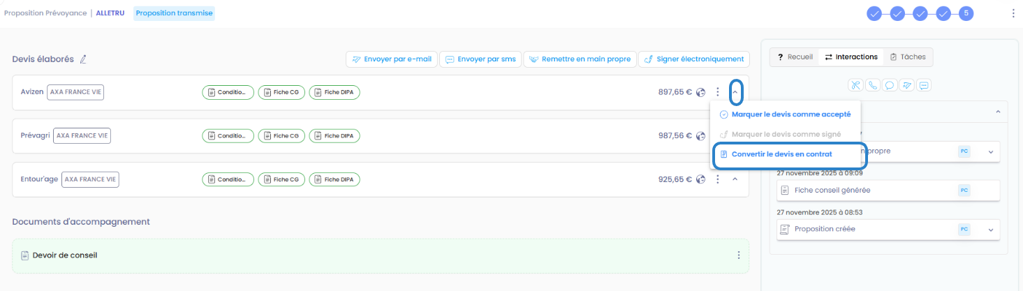 Une fois qu’un devis a été transmis et accepté ou signé par le client, vous pouvez le convertir en contrat. Cela permet d’enclencher le processus de souscription et de finaliser le dossier sans ressaisie inutile.