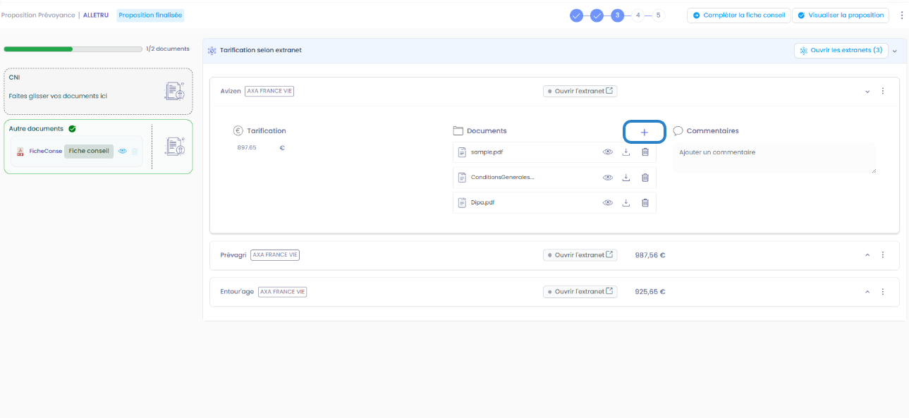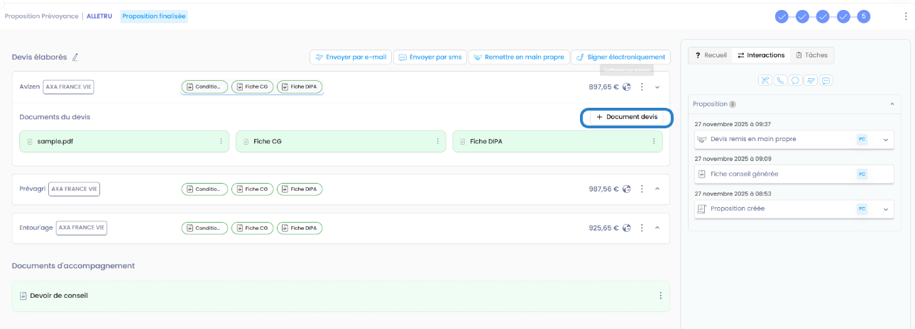 Chaque devis peut contenir des documents spécifiques comme les conditions générales, la fiche DIPA, ou des annexes personnalisées (pièce contractuelle, RCP, etc.). Ces fichiers sont utiles pour les envois, la signature électronique ou pour l’archivage.