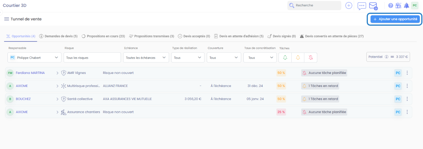 Dans ASSUR3D, une opportunité correspond à un contrat potentiel identifié chez un client ou un prospect. Elle peut être :