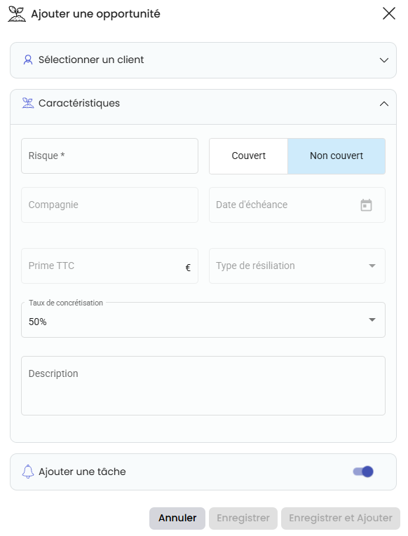 Une opportunité non couverte correspond à un risque ou besoin identifié chez le client, mais sans contrat en place. Par exemple : assurance d’un futur bien immobilier, prévoyance, retraite...