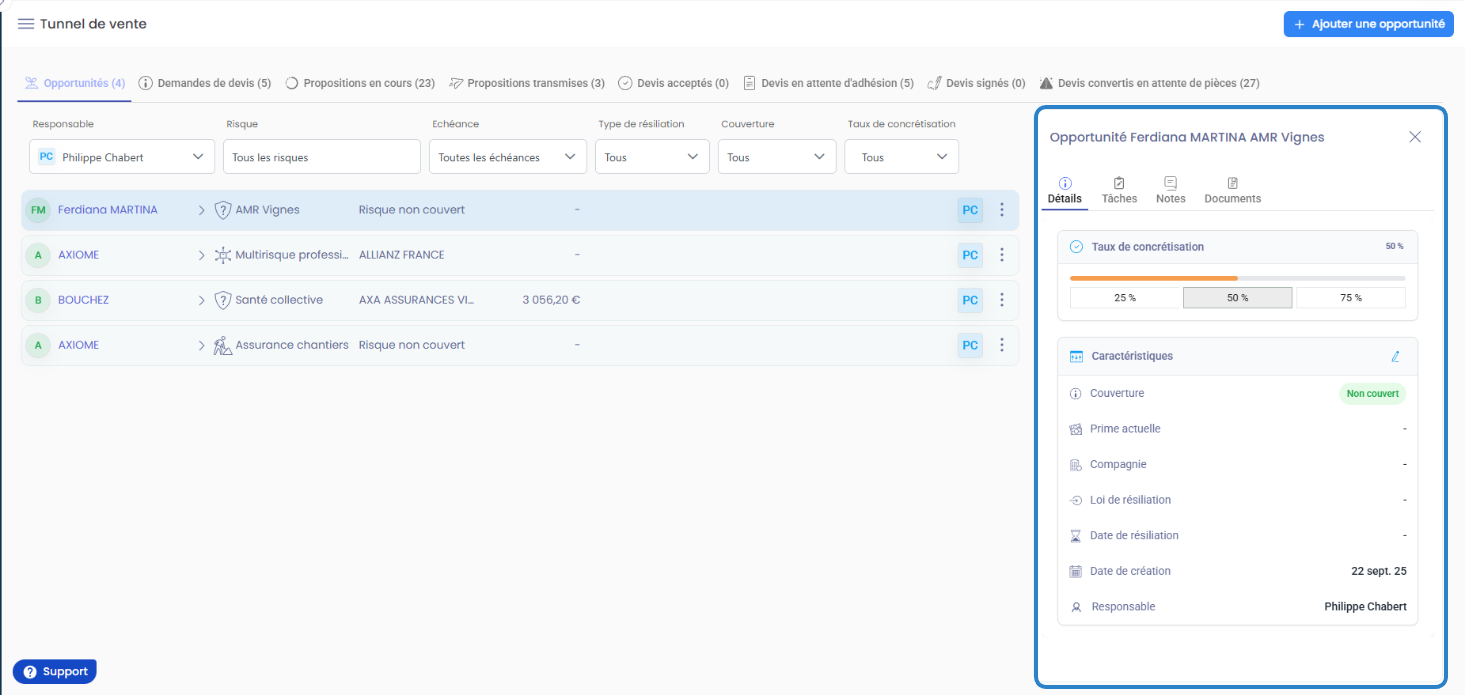 La fiche opportunité est une vue à 360° sur chaque opportunité commerciale. Elle constitue un levier essentiel de multiéquipement en vous aidant à identifier les besoins du client, organiser vos actions de suivi et transformer ces opportunités en contrats concrets.