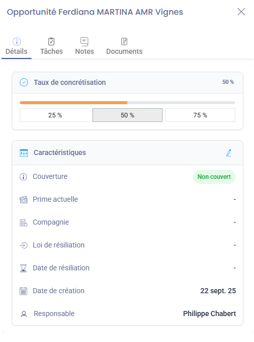 La fiche opportunité vous permet de suivre en détail chaque opportunité commerciale identifiée chez vos clients ou prospects. Elle centralise toutes les informations essentielles pour :