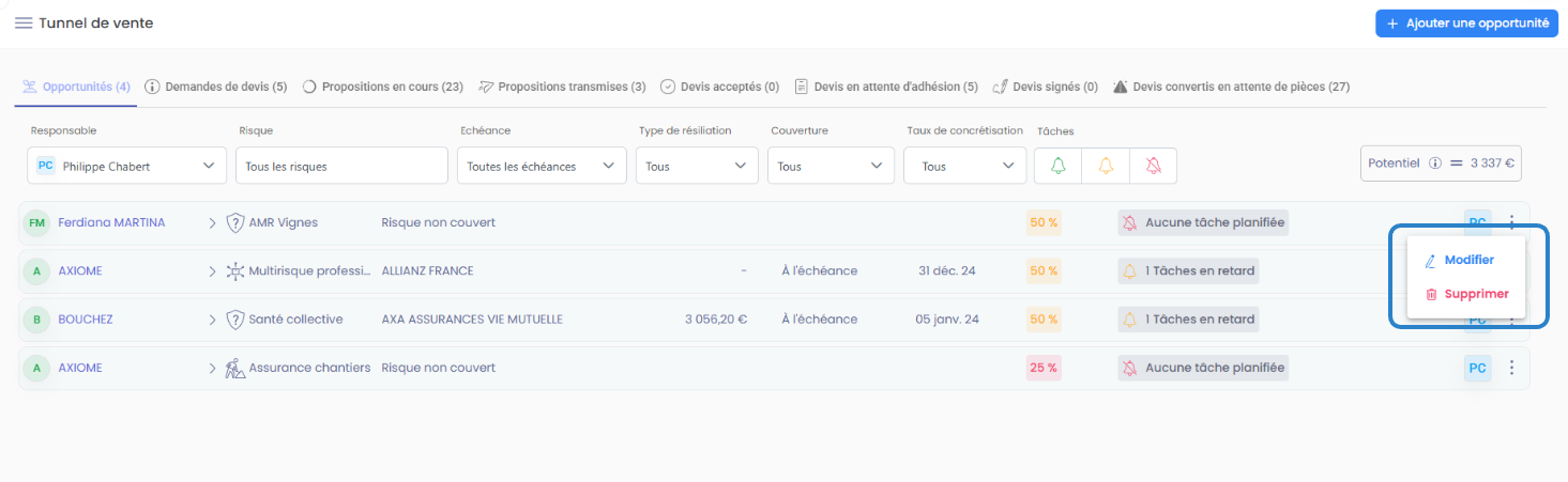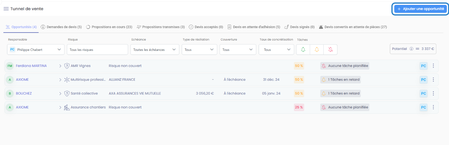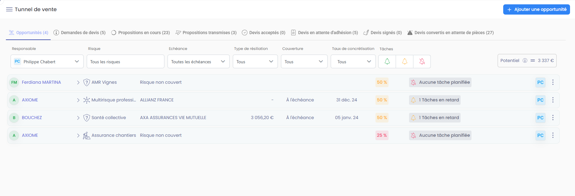 Le tunnel de vente d’ASSUR3D permet de centraliser toutes vos opportunités commerciales en un seul endroit. Plus particulièrement, l’onglet Opportunités vous donne une vision claire et filtrable de toutes les pistes commerciales en cours.