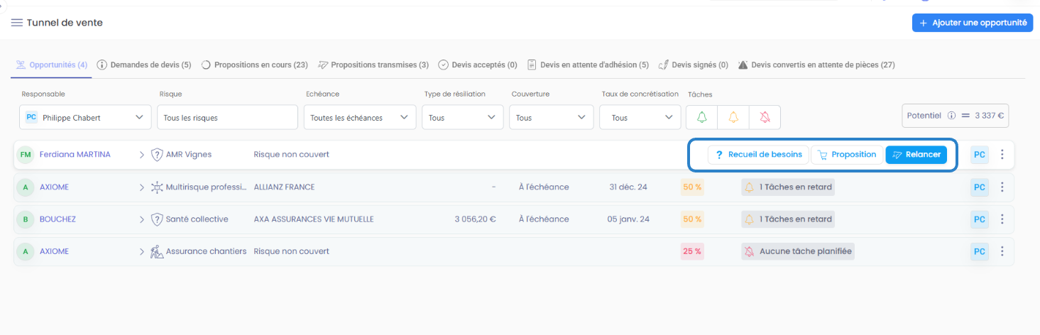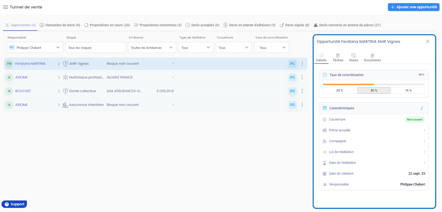 Le tunnel de vente vous offre une vue structurée de toutes vos opportunités. En quelques clics, vous pouvez les filtrer, analyser, enrichir ou transformer. C’est le point de départ stratégique de toute démarche de multiéquipement.