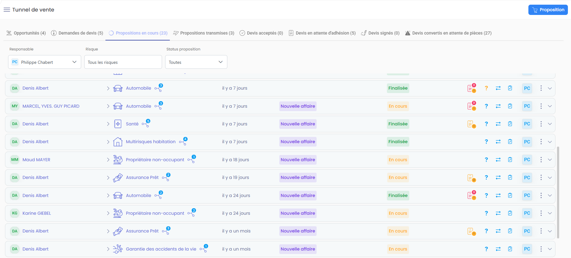 Chaque ligne représente une proposition commerciale. On y retrouve :