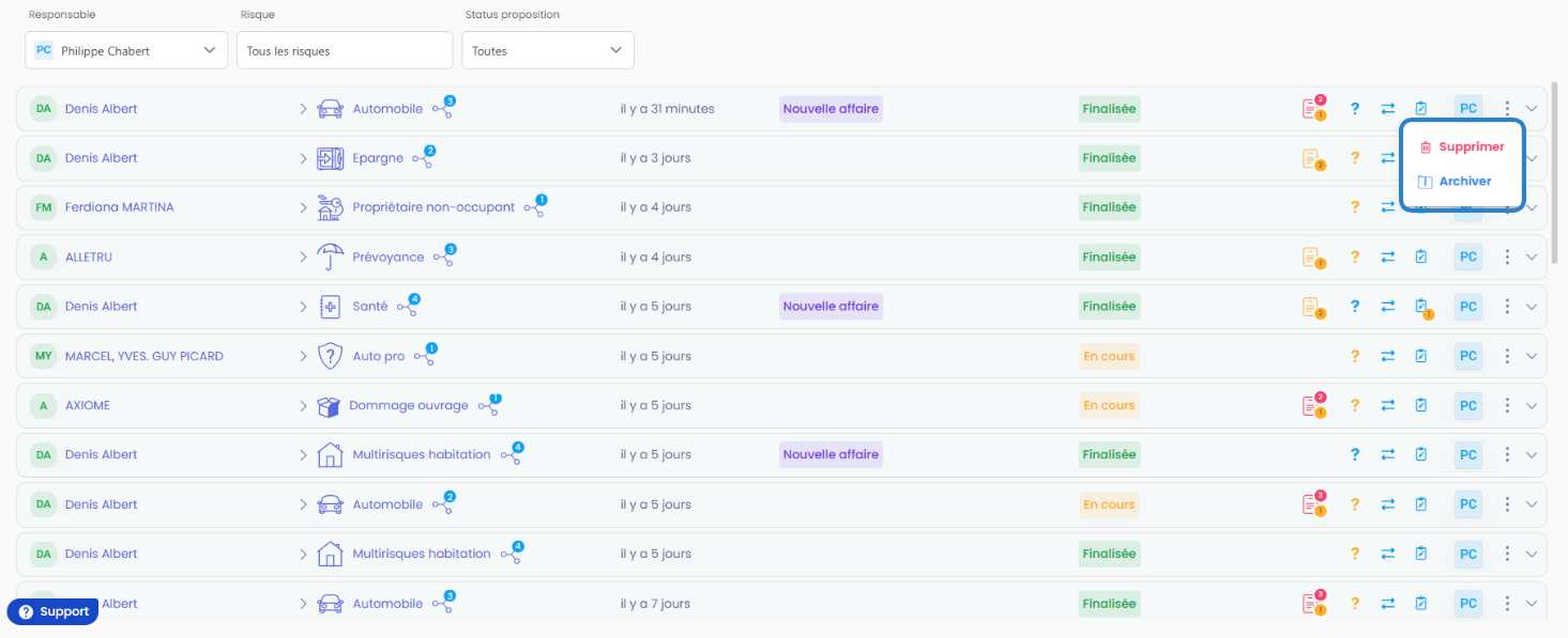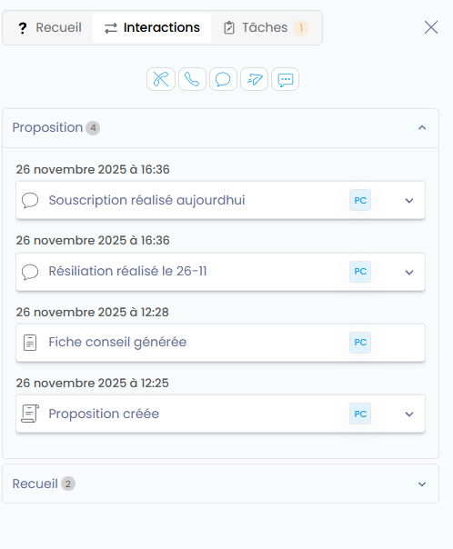 Interactions : appels, messages, relances... l’ensemble du journal d’activité de la proposition
