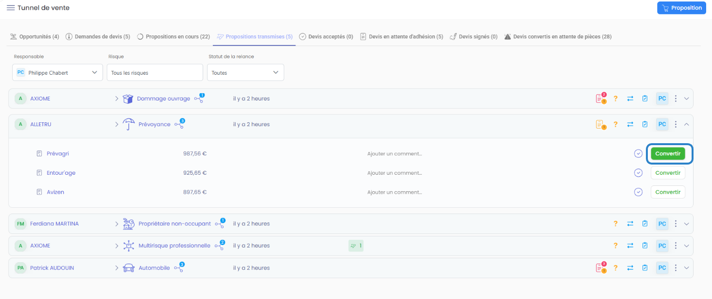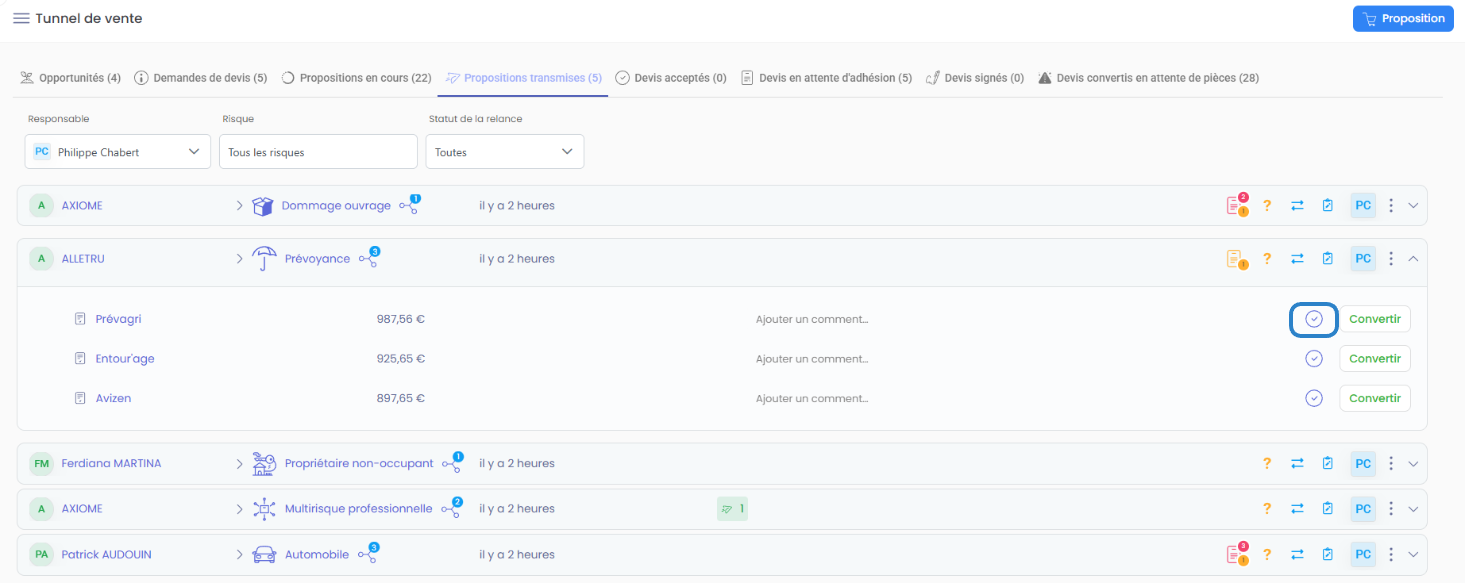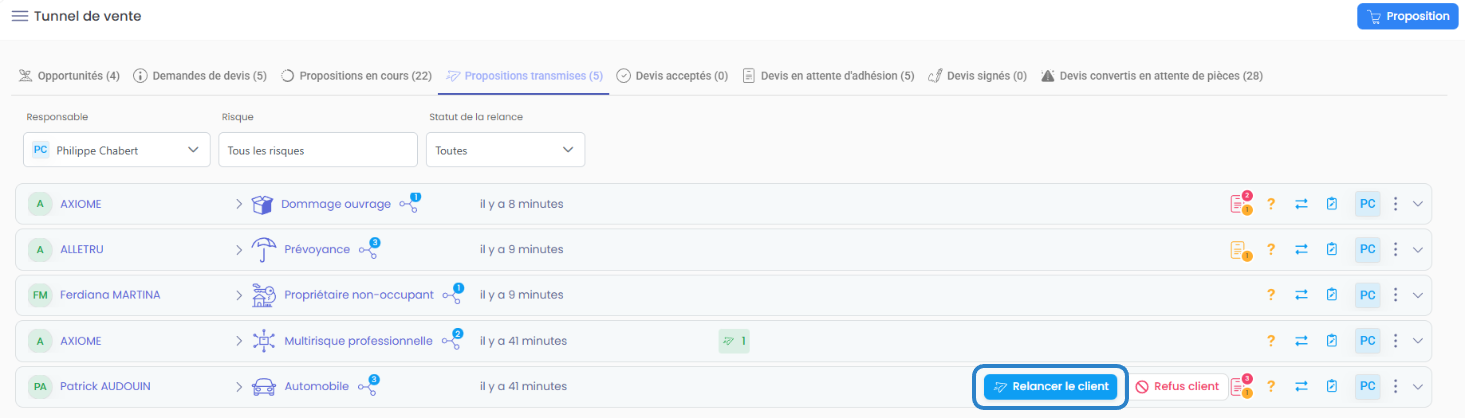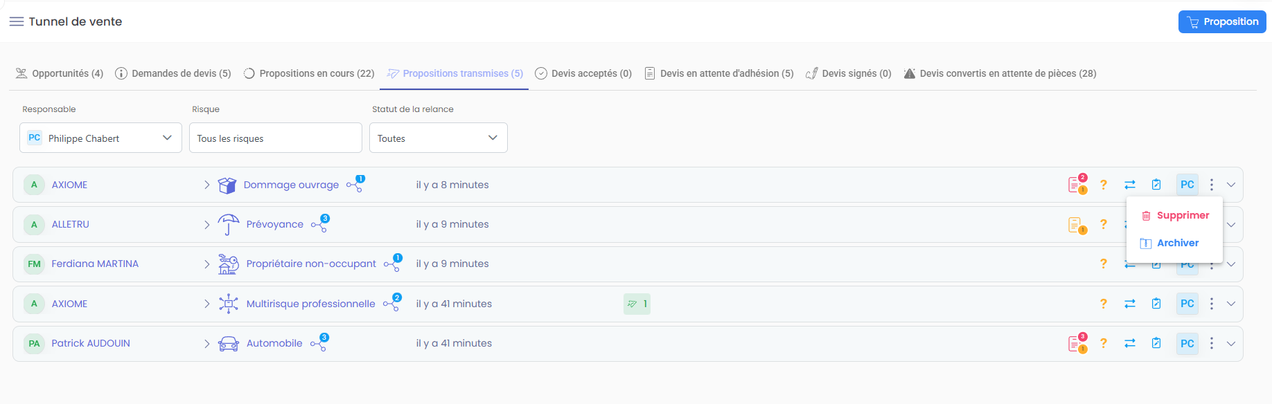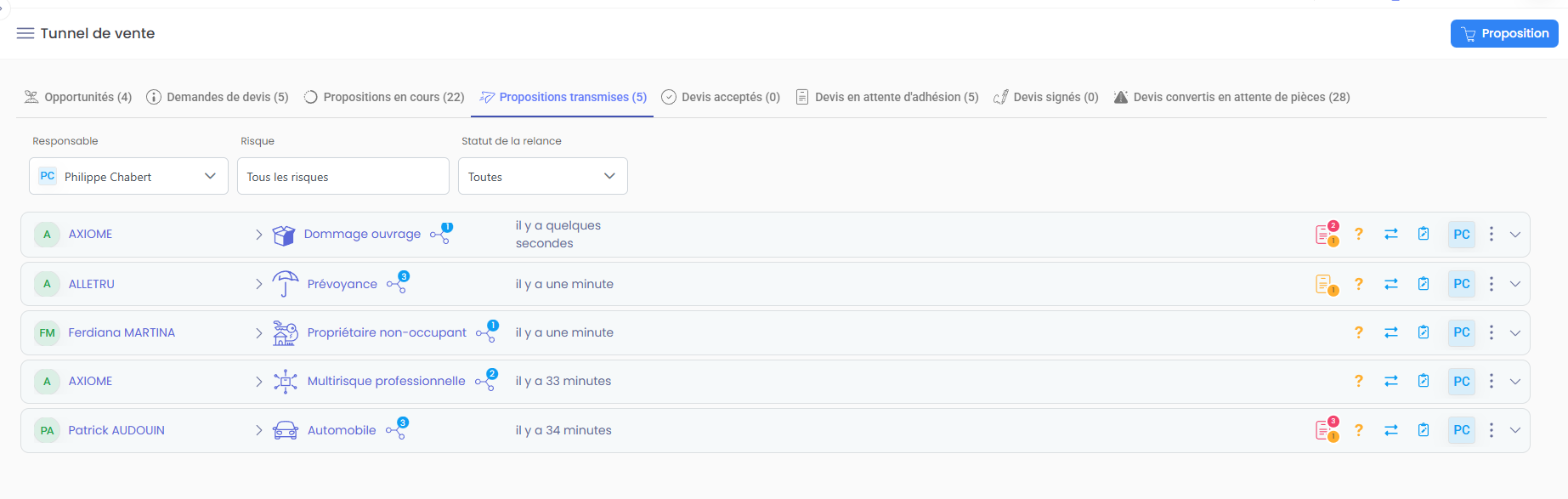 L’onglet Propositions transmises du tunnel de vente vous permet de suivre tous les devis envoyés aux clients. C’est une phase essentielle dans le parcours de souscription, car elle vous aide à savoir qui a été relancé, qui attend une réponse, et quelles sont les opportunités à raviver.