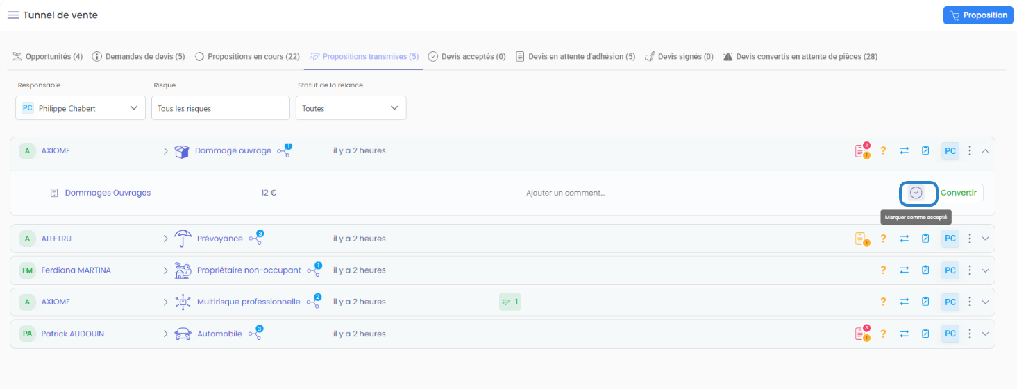 Vous pouvez cliquer sur "Marque comme accepté" depuis la ligne de la proposition concernée, si vous avez un retour verbal ou écrit du client.