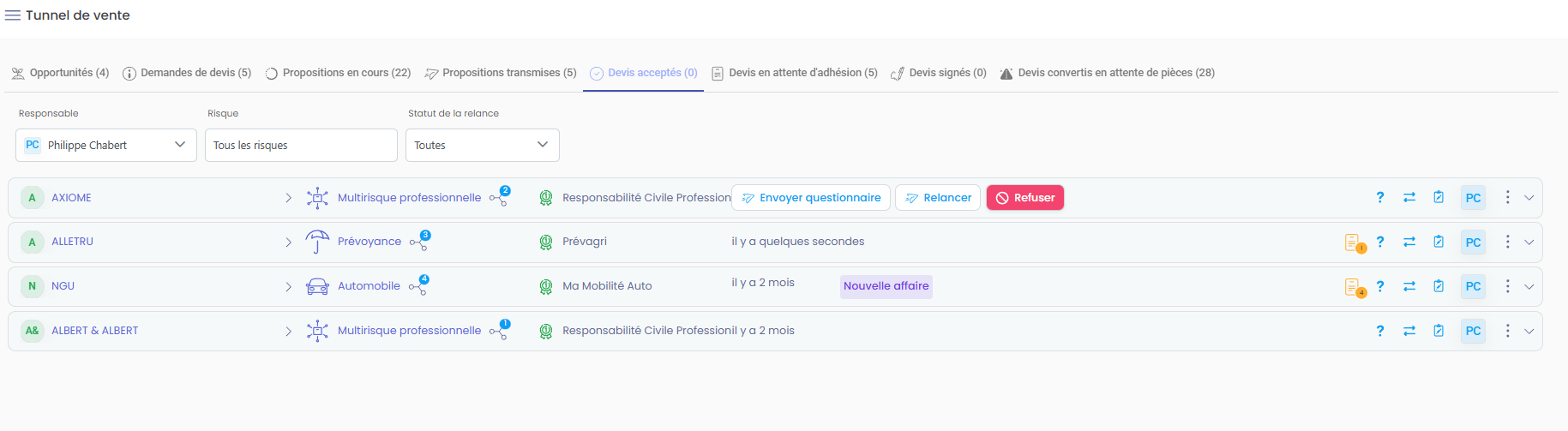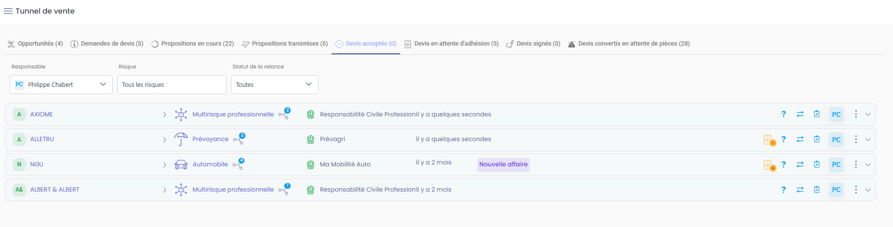 Une fois la proposition acceptée par le client, elle passe automatiquement dans l’onglet Devis acceptés du tunnel de vente. C’est une étape charnière, juste avant la création du contrat.