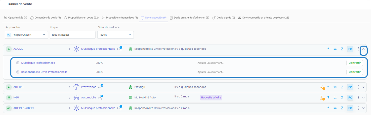 Cliquez sur la ligne de la proposition pour afficher les devis finalisés, puis cliquez sur le bouton "Convertir" correspondant au devis à transformer.