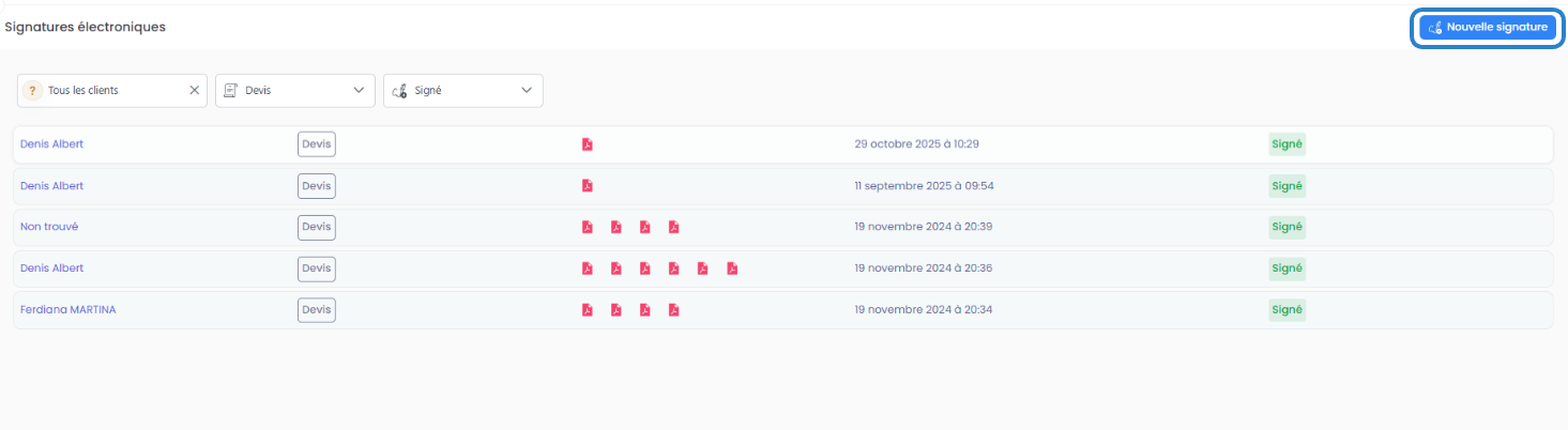 Vous les retrouvez à l’endroit d’origine (fiche client ou contrat), ainsi que dans le module Signature électronique, avec le statut "signé".