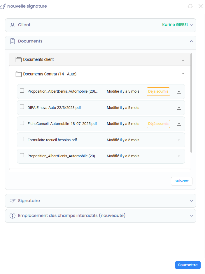 ➡️ Pour des documents liés à un contrat : assurez-vous que le contrat est déjà créé et que les documents à signer y sont bien enregistrés.