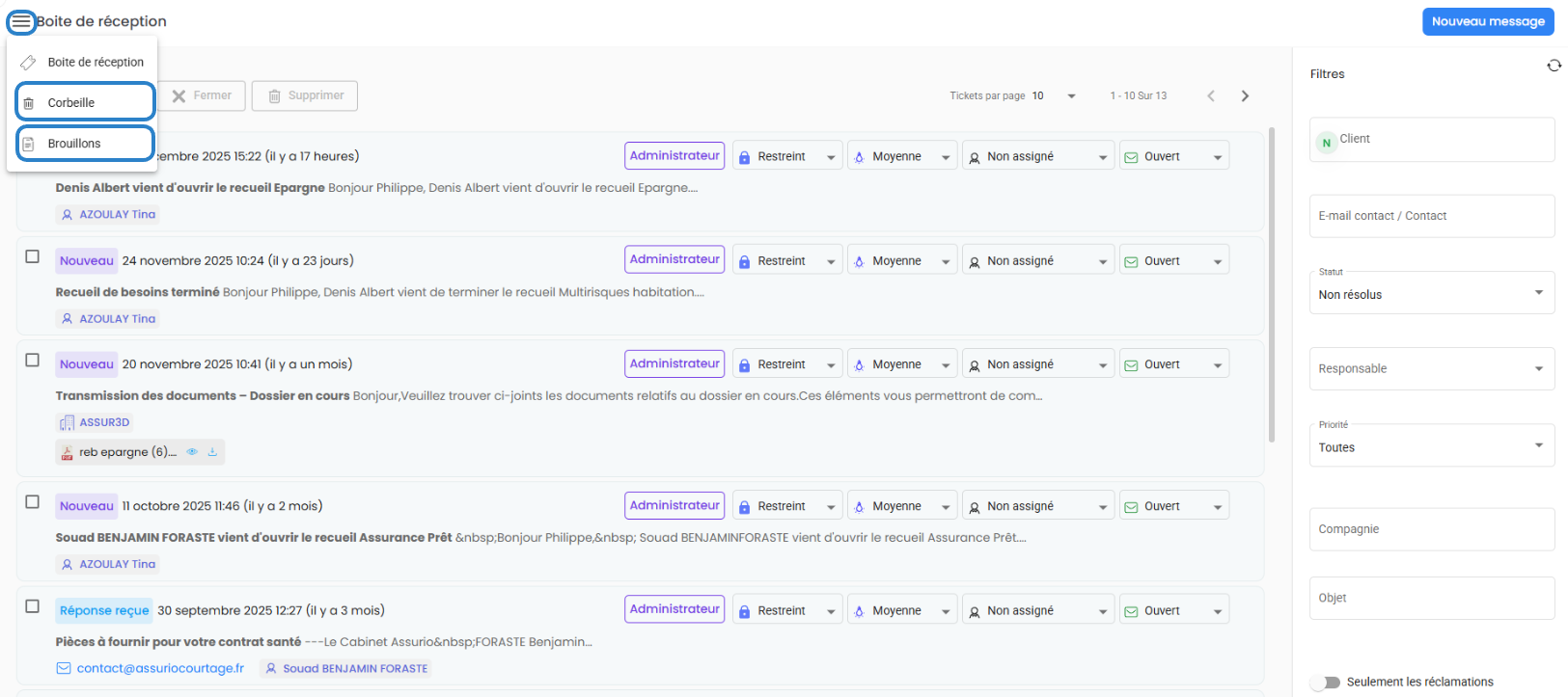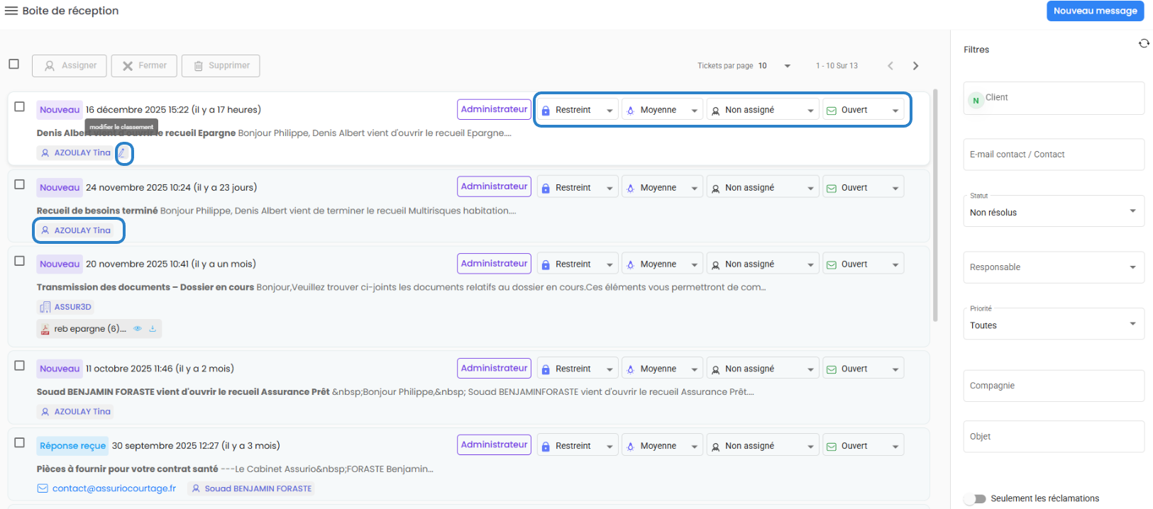 Le module Tickets d'ASSUR3D permet aux courtiers de gérer leurs e-mails directement dans le CRM. Chaque e-mail reçu ou envoyé devient un ticket, c’est-à-dire une demande traçable, classable et partageable. L’objectif :