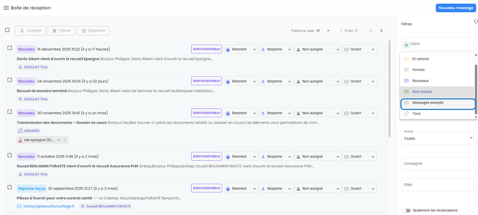 Les Messages envoyés : pour consulter tous les tickets correspondant à des e-mails envoyés.