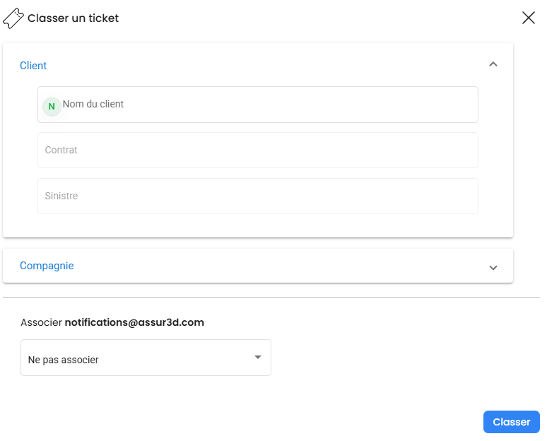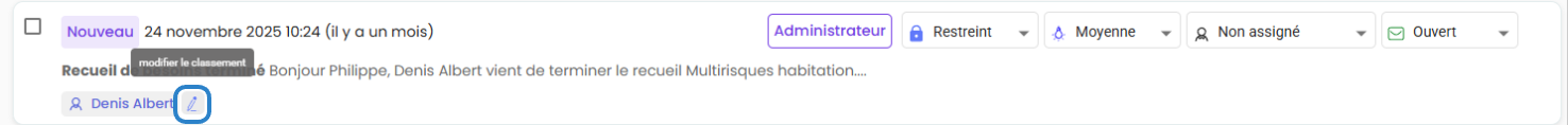 La fonction de modification de classement est utile pour corriger une erreur ou ajuster le rattachement d'un ticket. Cela garantit une gestion rigoureuse des e-mails et une meilleure organisation de vos dossiers.