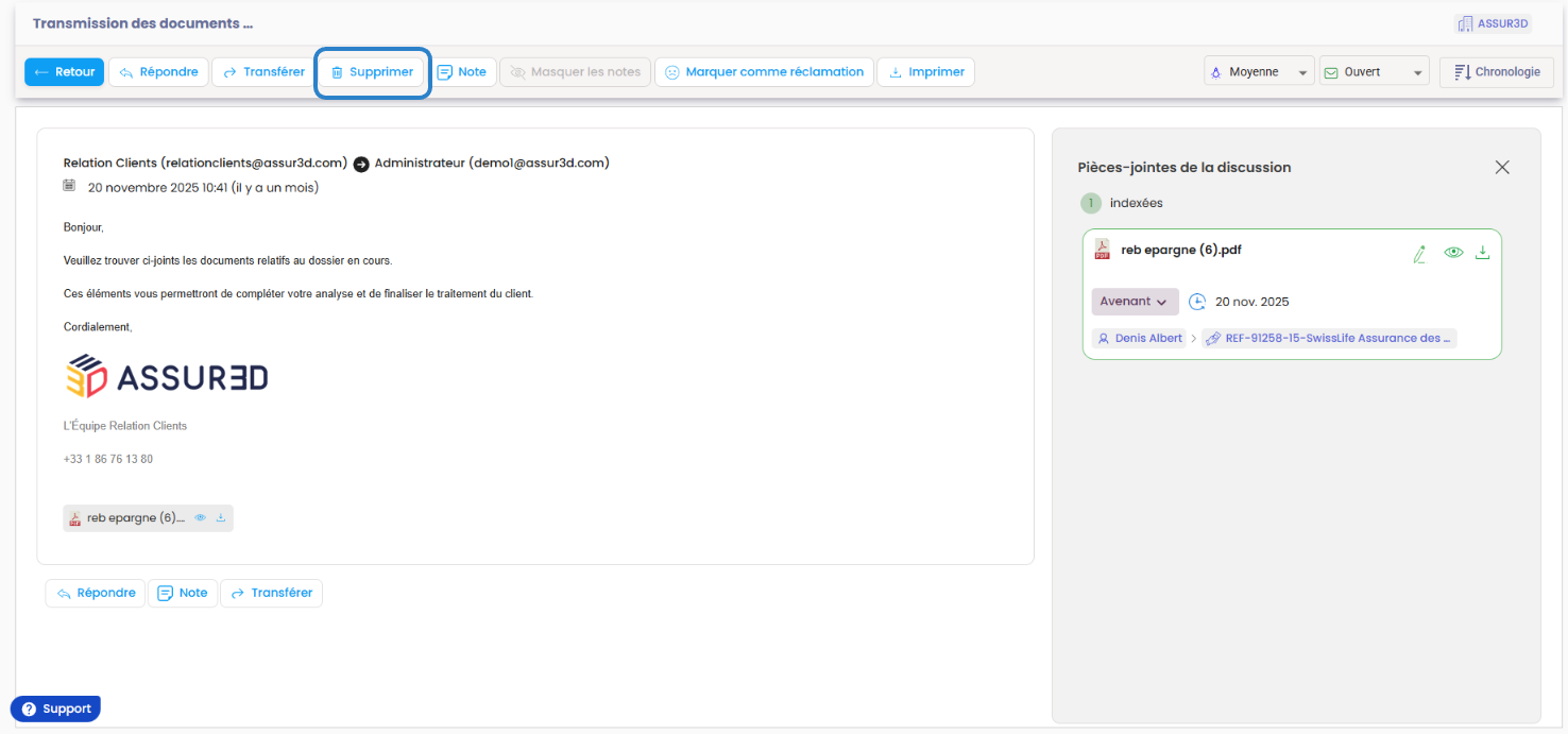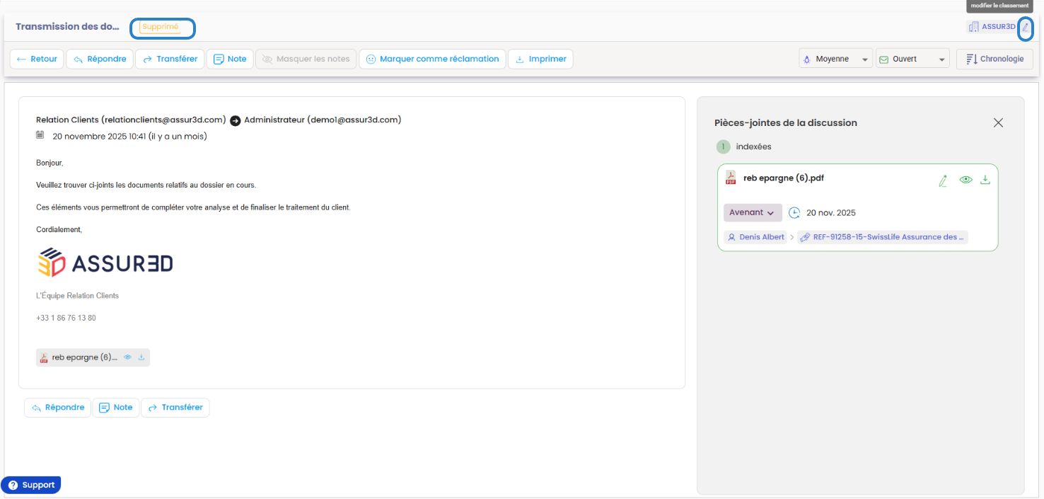 Lorsqu’un ticket supprimé est associé à un client, contrat ou sinistre, il reste visible sur la fiche concernée avec un tag indiquant qu’il est supprimé. Pour le faire disparaître complètement de cette fiche, il faut supprimer son classement depuis les détails du ticket :