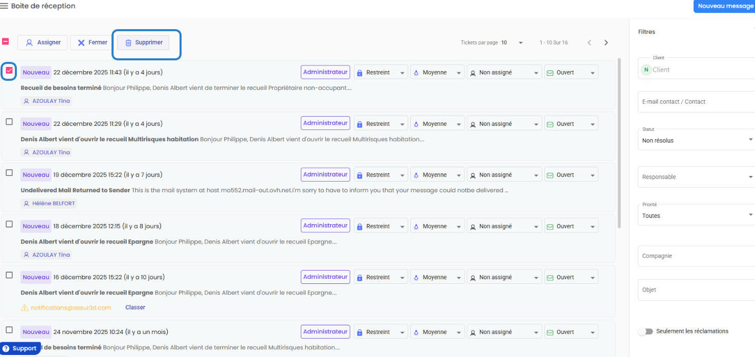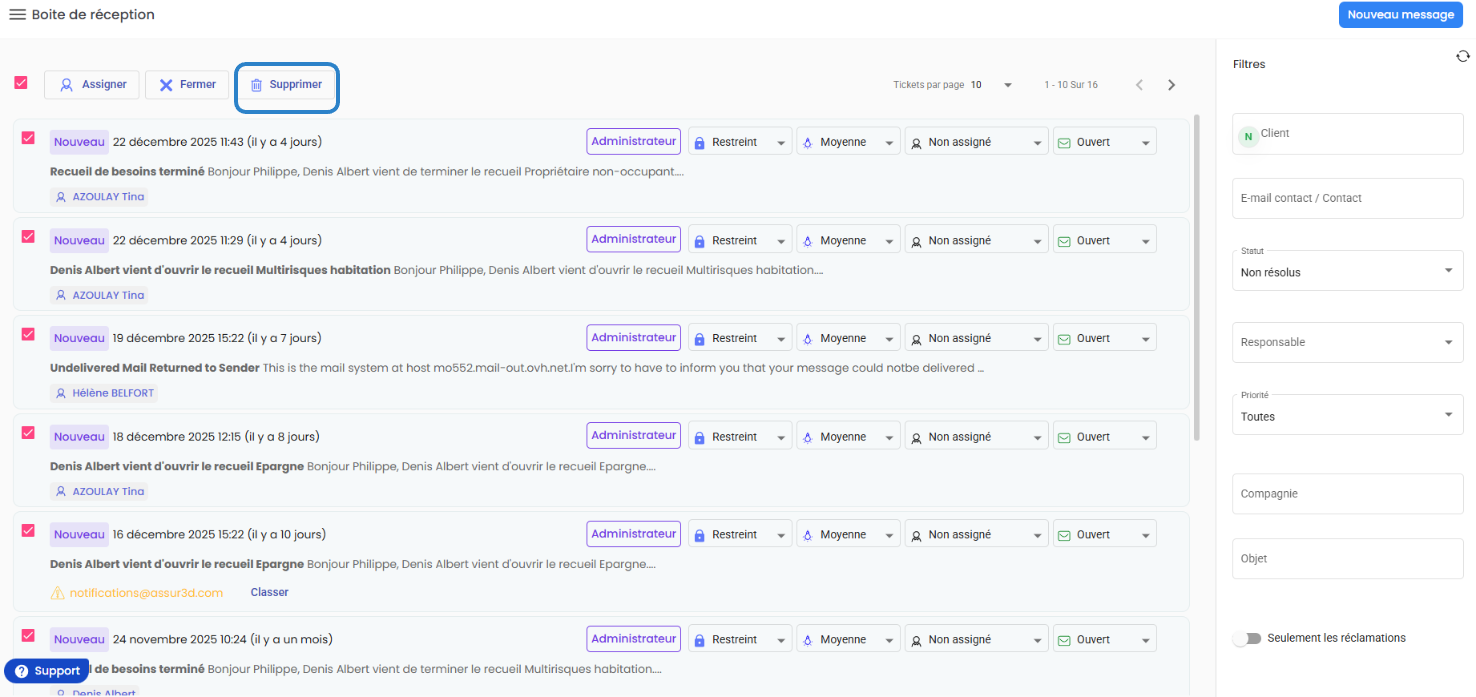 La suppression d’un ticket permet de nettoyer votre boîte de réception des messages inutiles, obsolètes ou sans lien avec votre activité (ex : spam, erreur de destinataire, etc.). Cela vous aide à garder un environnement de travail clair et recentré sur les échanges utiles.