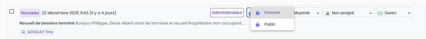 Important : si le ticket est reçu via une adresse e-mail confidentielle (non partagée), il sera automatiquement en statut Restreint. Dans ce cas :
