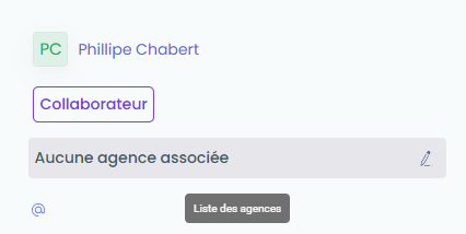 Survolez le champ indique "Aucune agence associée" pour faire apparaître l’icône ✏️ permettant de modifier l’association.