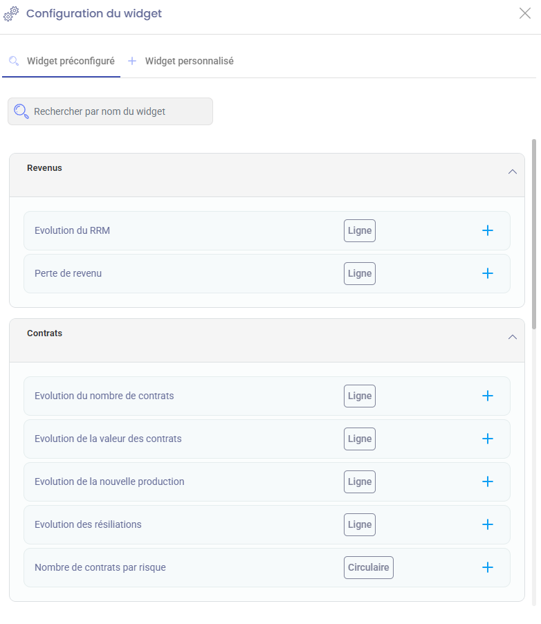 Dans l'onglet "Widget préconfiguré", vous pouvez parcourir les catégories disponibles :