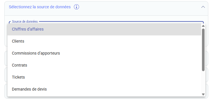 Choisissez la source qui correspond à ce que vous voulez analyser (ex. Clients, Chiffres d’affaires, Tickets…).