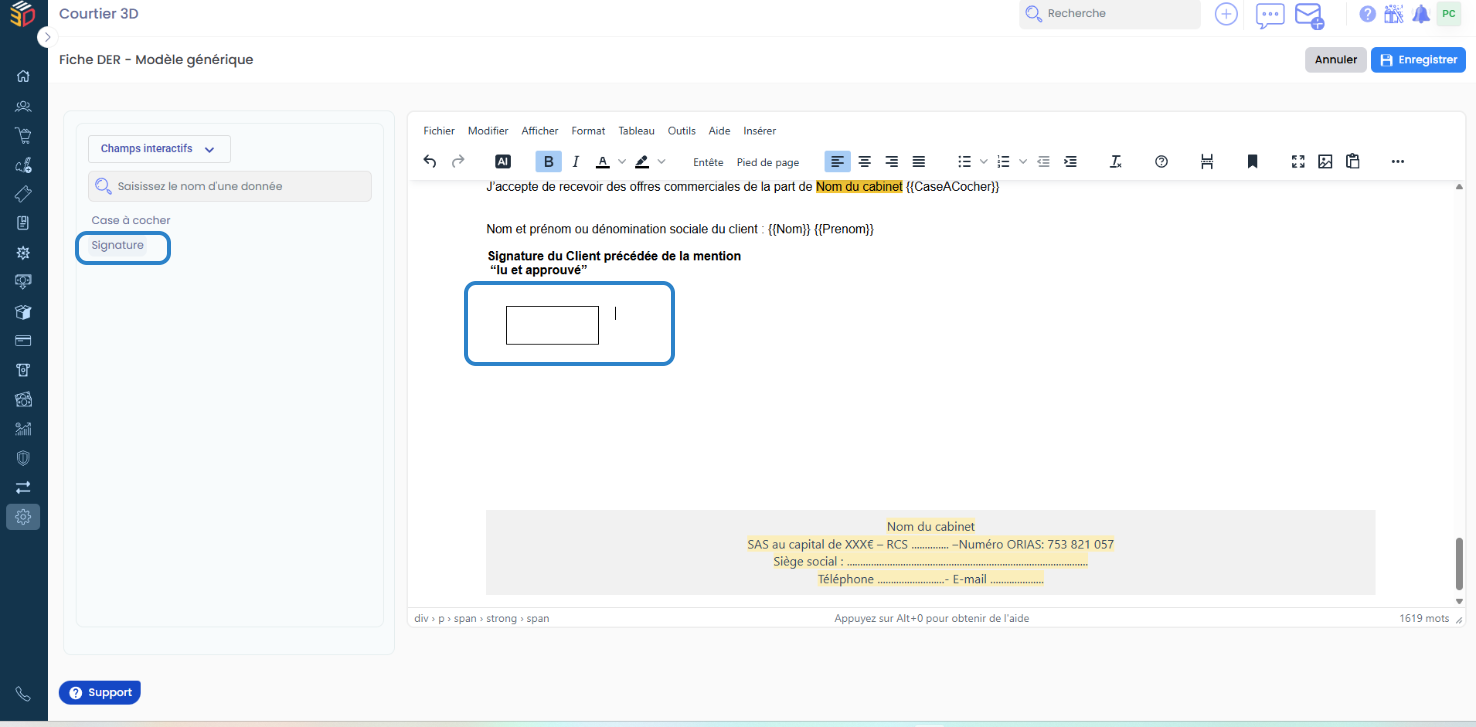 Dans ASSUR3D, la signature électronique peut être positionnée à l’endroit souhaité dans vos modèles de documents DER, devoir de conseil, mandat, etc. afin que le document soit signé dans l’emplacement dédié lors de sa génération.