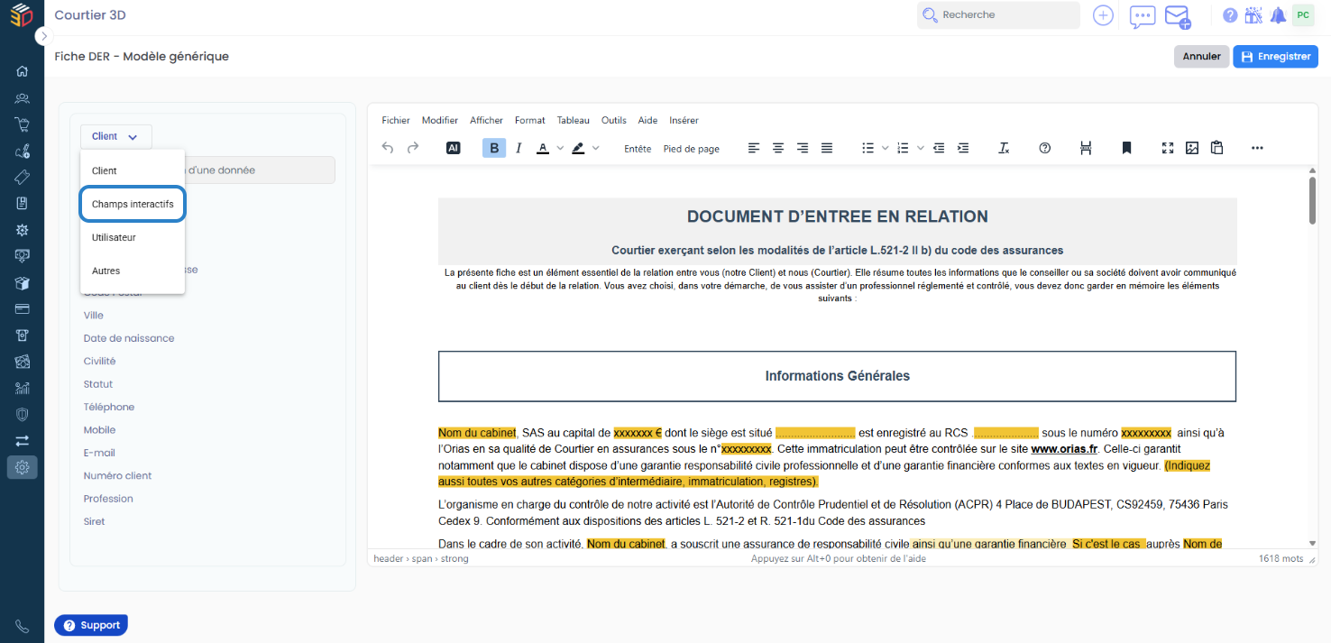 Ouvrez le modèle de document concerné (ex : DER, devoir de conseil, etc.).