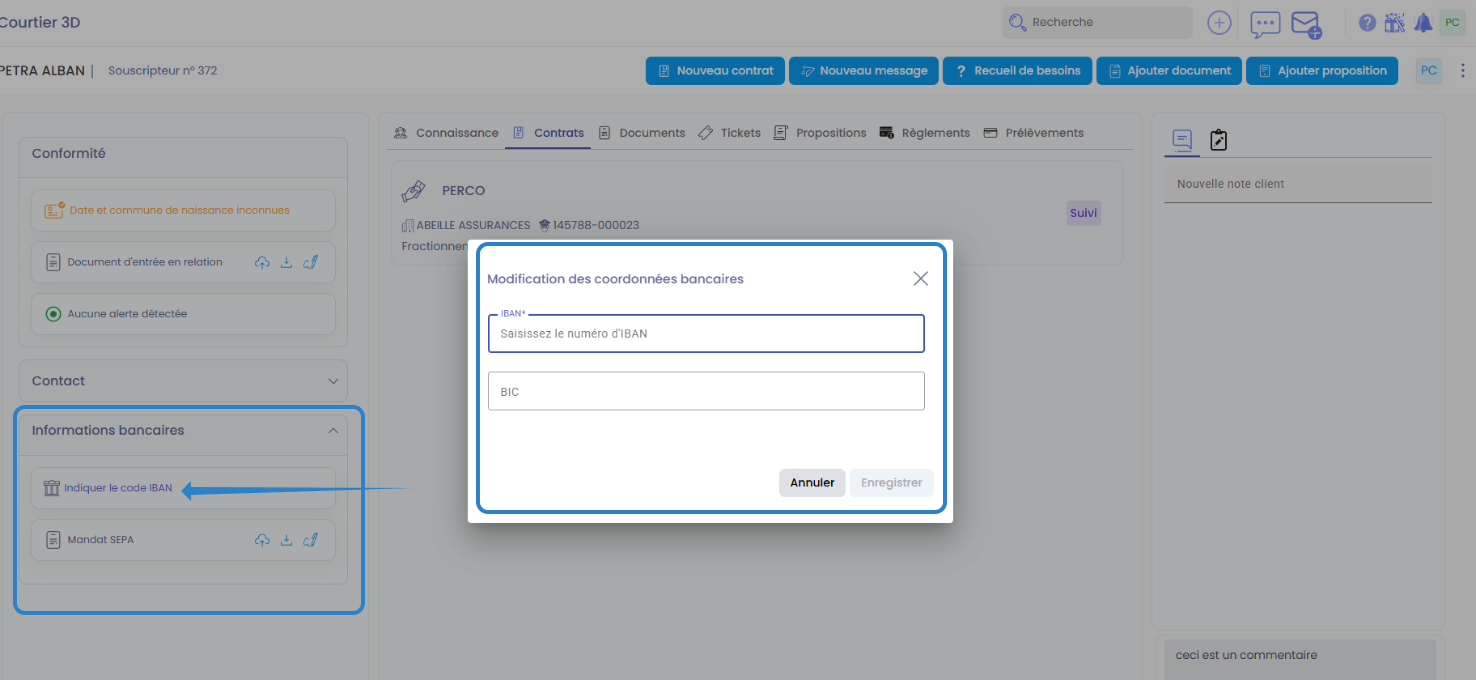 Cette fonctionnalité est utile au quotidien pour sécuriser vos encaissements, éviter les échanges manuels et centraliser les informations bancaires du client dans son dossier.