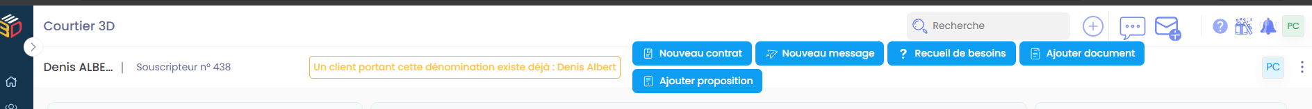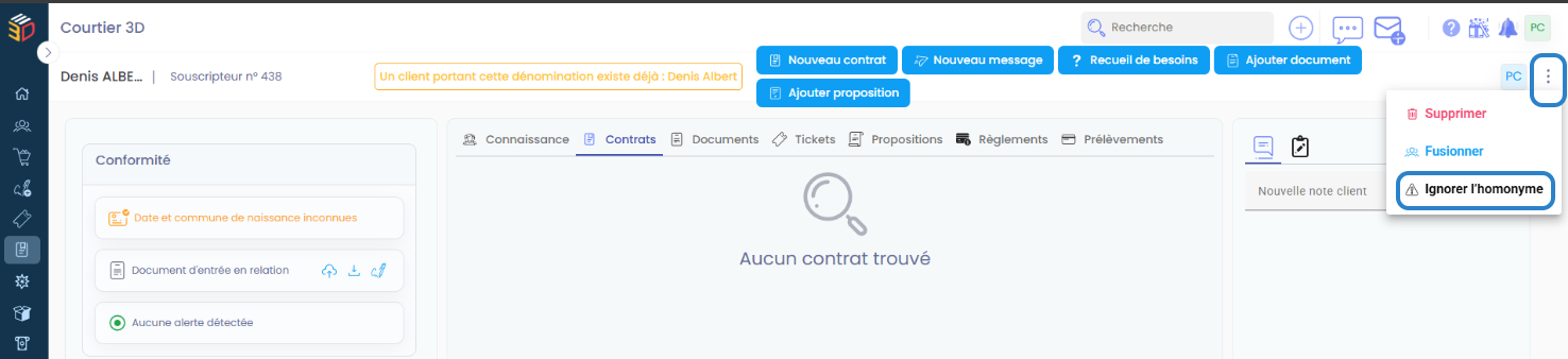 Lors de la création ou de la consultation d’une fiche client, ASSUR3D détecte automatiquement les possibles doublons basés sur un homonyme (même nom et prénom).