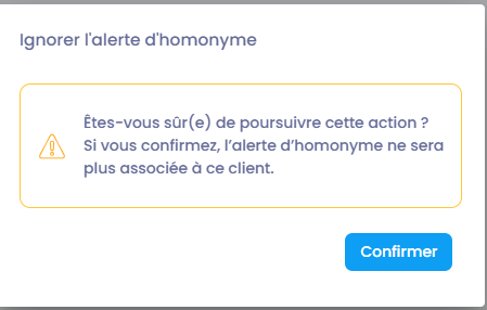 Cependant, il arrive que deux personnes différentes portent exactement le même nom et prénom. Dans ce cas, vous pouvez ignorer l’alerte pour continuer à travailler sans blocage.