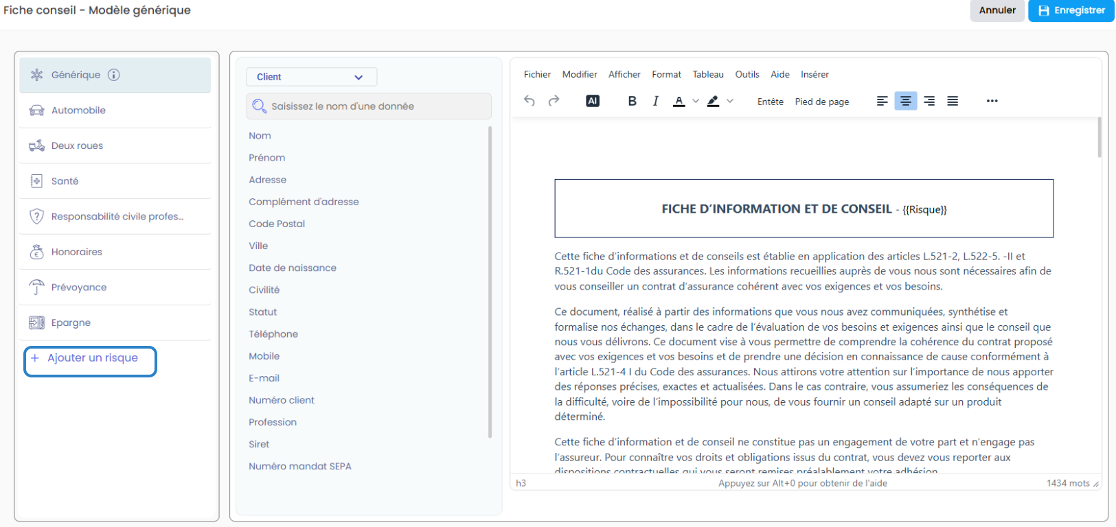Lorsque vous cliquez sur “+ Ajouter un risque”, ASSUR3D duplique automatiquement le modèle générique.