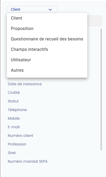 Les balises permettent d’insérer automatiquement des données issues de votre CRM dans la fiche de conseil. Chaque catégorie correspond à une source de données :
